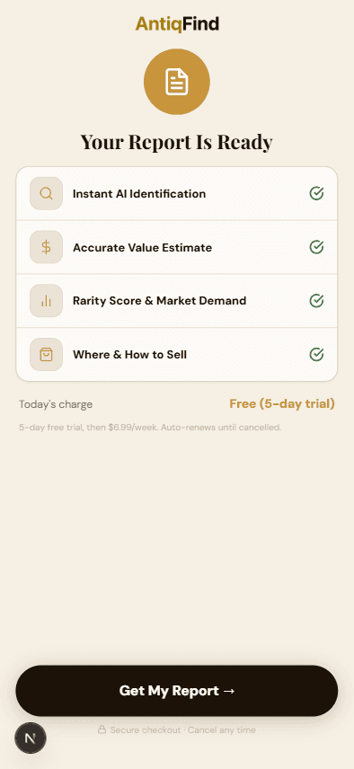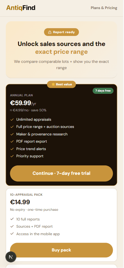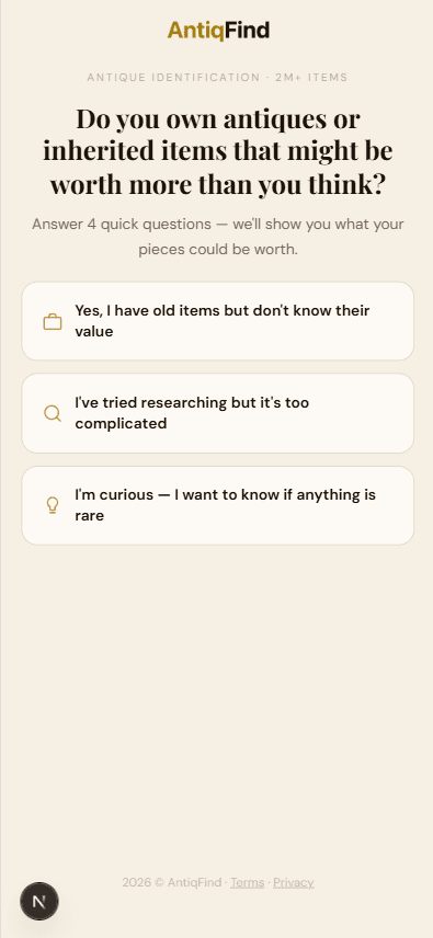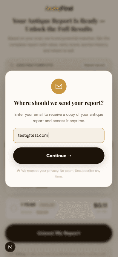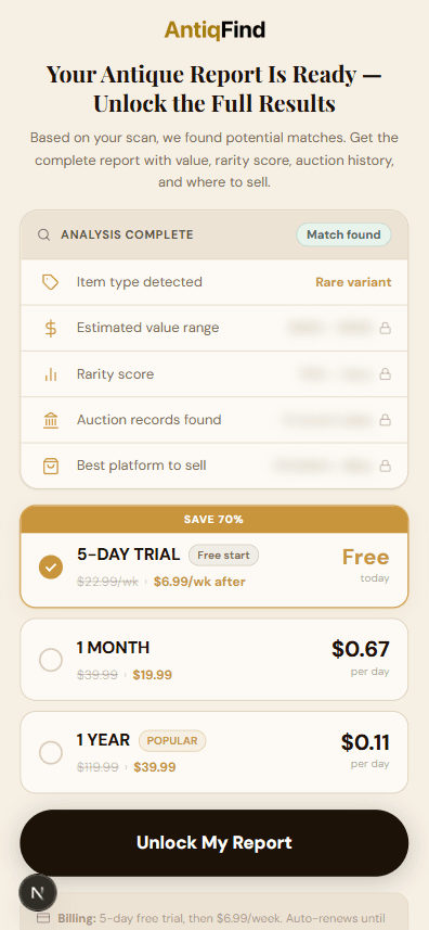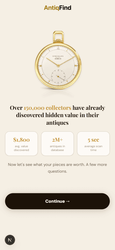 To support app growth, I designed and built two conversion-focused marketing funnels alongside the mobile product. The core mechanic: a blurred antique valuation report with a fixed CTA — creating curiosity and driving installs.
