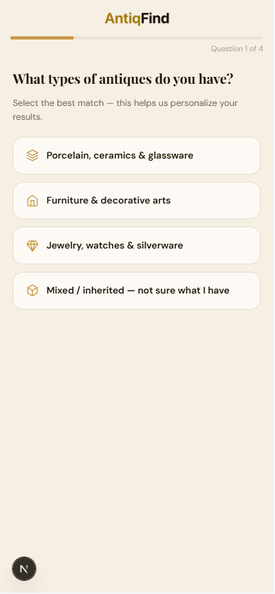 AntiqFind is a cross-platform iOS/Android app that helps users discover, identify, and track the market value of antiques. The project also includes a web marketing funnel designed to convert visitors into app users. I joined as the sole designer on a short-term contract and delivered the full product design — UX flows, UI, and a conversion-focused web funnel.